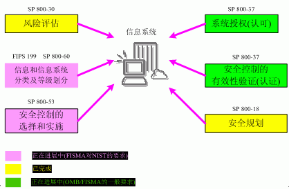 從圖中可見,新建或再建的信息系統(tǒng)必須實施定期的風(fēng)險評估(SP800-30),以分析信息系統(tǒng)面臨的威脅、信息系統(tǒng)存在的脆弱性,信息系統(tǒng)可能遇到的安全事件損失及由此導(dǎo)致的風(fēng)險;同時,風(fēng)險評估將為信息系統(tǒng)確定其安全需求;隨后,應(yīng)根據(jù)風(fēng)險評估中確定的信息系統(tǒng)在機密性、完整性和可用性方面存在的風(fēng)險,確定信息系統(tǒng)的安全類別和等級(FIPS199);針對信息系統(tǒng)的安全類別和等級,將為其選擇有效的安全控制(SP800-53),以實現(xiàn)合適的安全等級(SP800-60);上述過程確定的安全需求、安全控制均將列入信息系統(tǒng)的安全計劃(SP800-18)并得到實施(SP800-53)。此后,應(yīng)定期通過安全測試和評估來衡量信息系統(tǒng)中安全控制的有效性,即信息系統(tǒng)安全認(rèn)證工作(SP800-37);最終,基于安全控制的有效性和殘余風(fēng)險值,由聯(lián)邦機構(gòu)的高級官員決定是否授權(quán)信息系統(tǒng)投入運行,即信息系統(tǒng)的安全認(rèn)可工作(SP800-37)。而且由于信息技術(shù)的發(fā)展、業(yè)務(wù)需求的變革,外部環(huán)境的變化均可能使信息系統(tǒng)的安全態(tài)勢發(fā)生改變,因此上述過程是動態(tài)的,且需定期重復(fù)。