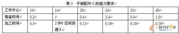 計算子裝配件C的能力需求就是一個累加零件D和零件E的工藝路線信息的過程。我們注意到,在工作中心40(研磨工序)準備時間為1小時,其中,加工零件D的準備時間為0.6小時,加工零件E的準備時間為0.4小時。加工時間是0.29小時。因為對零件D和零件E的研磨加工出現在同一時區,所以把兩項負荷加在了一起。否則,應當分開。對其他工作中心也類似地進行計算。對于工作中心14(淬火工序)的負荷不是以標準小時為單位,而是以零件的個數表示(零件D和零件E各1件)。這項負荷要求的是空間資源。子裝配件C的能力需求如表3所示。