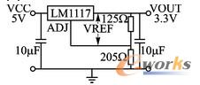 本設計采用了可調三端穩壓器LM1117TADJ,可以將電壓進行線性轉換,電流為800mA,3引腳的TO200封裝。Cyclone系列FPGA上電的最大電流為300mA,該芯片可以滿足要求。LM1117需要在輸出與地之間接入電容以維持內部電路的穩定,輸入與地之間也需要接入電容對輸入信號進行濾波[4]。具體的連接如圖3所示。