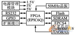 目前大部分Altera公司的FPGA均支持NiosII CPU,而Cyclone系列器件是當前世界上成本最低的FPGA芯片之一,因此本設計中的核心芯片采用Cyclone EP1C6,具有9800個邏輯單元,92Kb的RAM資源,提供兩個全功能的鎖相環(PLL)。I/O接口185個,還支持LVDS、DDR等傳輸接口。它的配置使用最新型的AS配置方式,配置芯片是EPCS4(Flash結構,4Mb)。