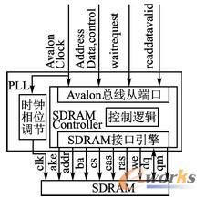 在NiosII系統中,SDRAM主要用于存放運行程序和數據,并且其運行速度比Flash快很多。所以在SOPC系統中,當系統啟動后,NiosII CPU首先從復位地址0x0處讀取啟動代碼,在完成系統的初始化后,程序代碼一般應調入SDRAM中運行,以提高系統的運行速度。平臺使用的是hynix57V641620HGT,其存儲容量為4Bank×1M×16位(64 Mb)。SDRAM與總線的連接關系如圖5所示,其刷新頻率是靠FPGA內的PLL經過相移來提供。