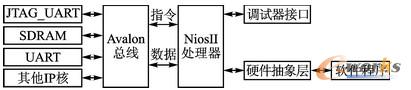 如圖7所示,采用NiosII單處理器,多個特定功能專用IP核的系統體系結構,軟件部分由處理器進行,而硬件部分功能由下載到FPGA上的IP核實現。硬件之間的通信以及與處理器的通信由Altera公司定義的Avalon片內總線實現,而硬件和軟件之間的通信則是通過由IDE根據硬件系統生成的硬件抽象層HAL來實現的。