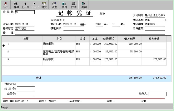 10、 編制:在如圖2-1所示的界面上選取某一分批檔,單擊菜單編制,即可在當前分批檔中編制憑證。憑證編制界面如圖2-3所示。